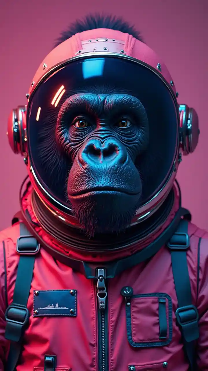 Retrato de gorila antropomórfico con traje espacial, ultra realismo, súper detallado, colores neón, portada de revista, toma profesional, fotografía de revista, colores saturados brillantes, enfoque nítido, altamente detallado