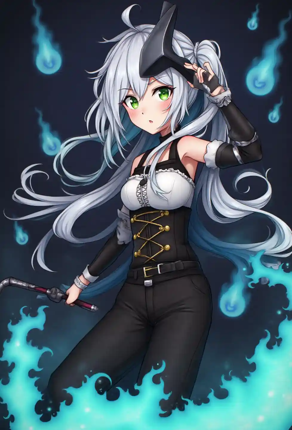 Estilo gótico, anime, chica, un corsé, Chakram en la mano, quemaduras de llama azul, pantalones negros, Un cara a cara, Cabello grande que cubre un lado de la cara, Eye burns green, Bl