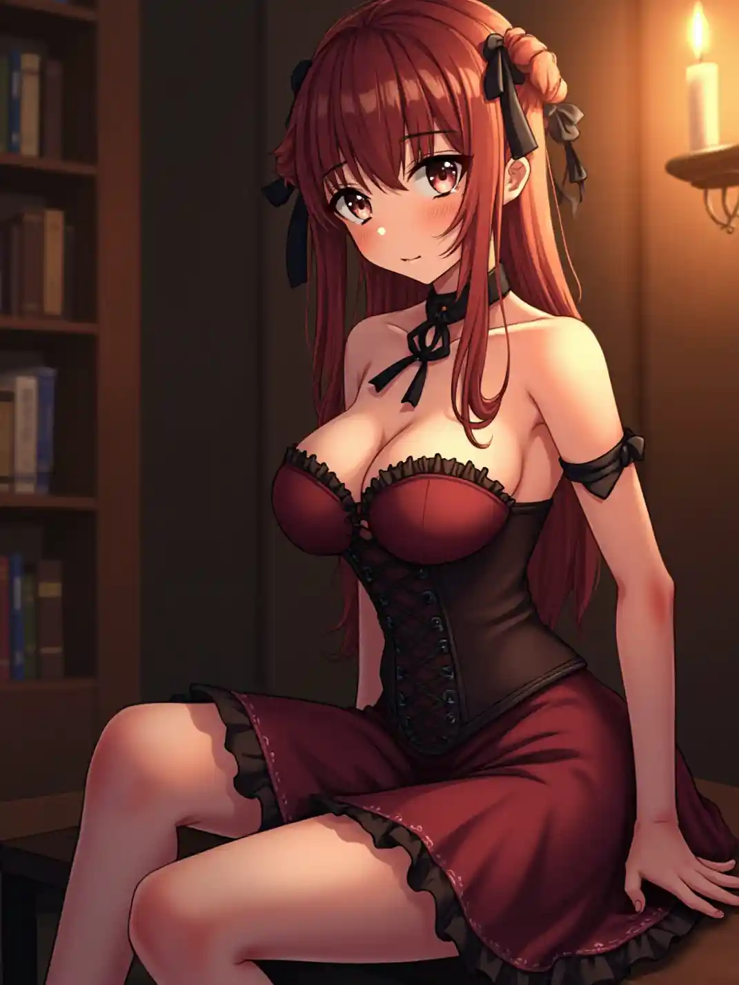 Imagen vertical a gran escala de una chica anime Ultra HD, increíblemente hermosa y sensual, brillando bajo la suave luz de las velas, sentada en una acogedora biblioteca interior con estantes de madera, con un vestido gótico de Lolita con corsé con cordones y falda con volantes, su cabello largo adornado con una cinta negra y una sonrisa suave, ojos amplios y brillantes, piel brillante, paleta de colores rojo intenso y marrón, rasgos delicados, maquillaje impecable, vibraciones íntimas y elegantes, iluminación cálida con un brillo suave, destacando su voluptuoso, pecho bien definido con un sutil escote, y piernas largas y tonificadas en medias de red con un atractivo y sofisticado.
