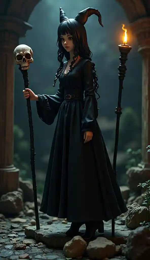 KinsleyUn vestido a escala 1/7 figura de anime de una chica de magia negra gótica que sostiene un bastón con un cráneo en la parte superior, de pie sobre un diorama de una cámara ritual oscura con g brillante