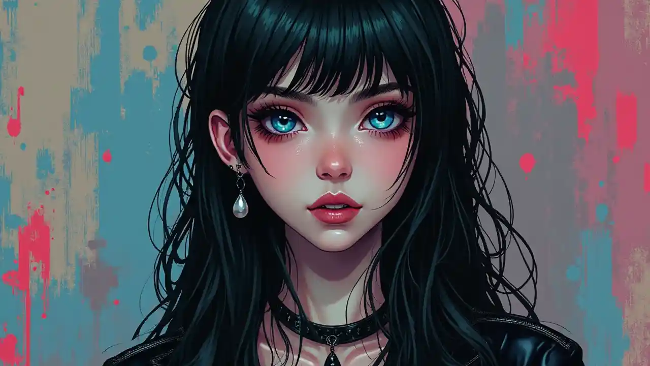 un retrato de una chica gótica de gen z rock, con cabello largo y negro que tiene un estilo entrecortado y en capas, con una chaqueta de cuero negro y una falda gótica negra, que es un poco corta en longitud. Su maquillaje vibrante es muy gótico, y tiene un maquillaje de ojos dramático con sombras de ojos vibrantes que la hacen parecer un poco misteriosa. Sus ojos son azules y tiene dientes blancos perfectamente rectos que son visibles desde sus labios ligeramente separados. La niña lleva un pequeño colgante de perlas que tiene forma de lágrima, y también lleva un pequeño pendiente negro en las orejas. La niña es muy abstracta en sus expresiones, y su rostro es casi angelical en un tipo misterioso y mítico de belleza. El fondo es una mezcla de pinceladas coloridas, que contrastan fuertemente con su imagen oscura, pero detallada y vívida, de cuerpo completo.