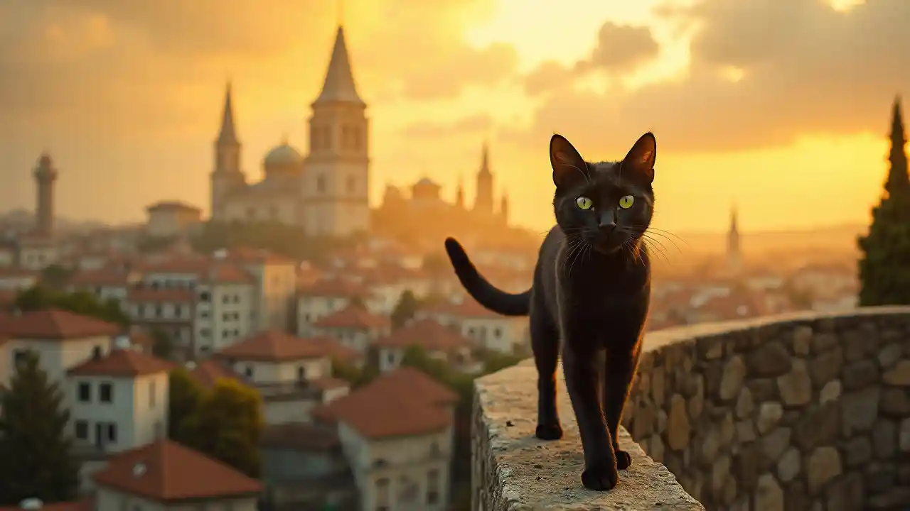 A ((((gato negro delgado y elegante))), con (((ojos vívidamente verdes))), paseando elegantemente a lo largo de un (((pequeño muro de piedra)) que serpentea a través de un ((ciudad con nubes altas y gigantes que se ciernen en el fondo)), de cara al espectador, sus patas sutilmente silbando de lado a lado mientras camina con confianza hacia adelante, rodeado por (un telón de fondo de un hermoso cielo amarillo lleno de atardeceres) que complementa la escena