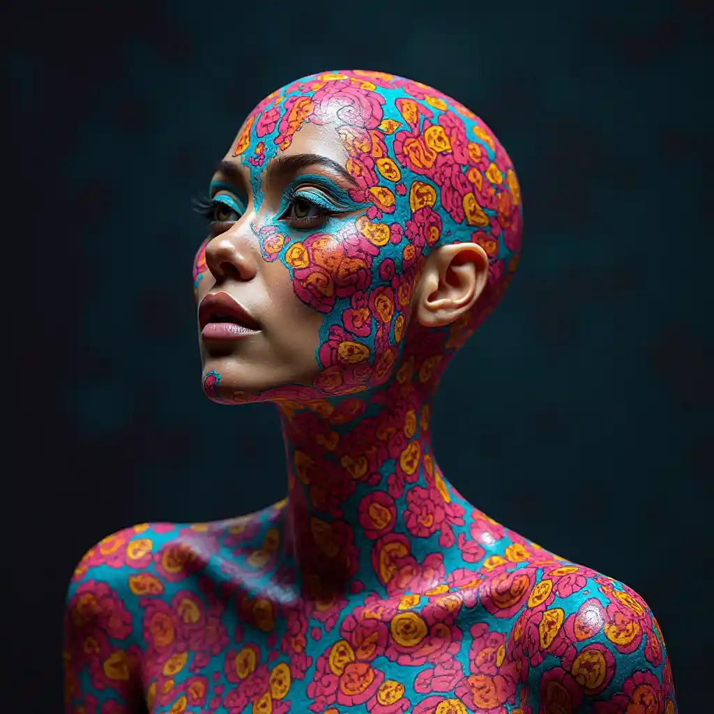 Adapte el estilo gráfico distintivo del modelo, que abarca colores llamativos y vibrantes y texturas intrincadas, para reimaginar la imagen de referencia con una estética única y de alto contraste. La escena se desarrolla contra un fondo rico y oscuro que profundiza el impacto visual, permitiendo que el estilo gráfico adaptado tome el centro del escenario.
