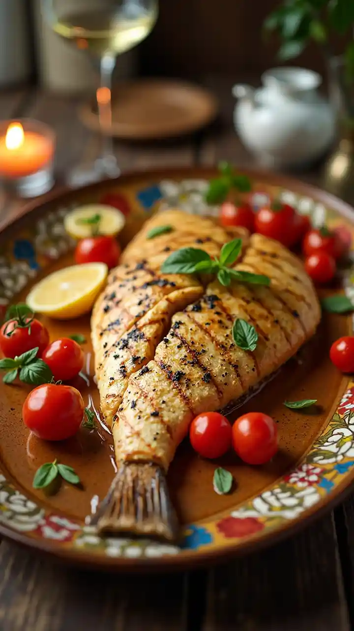 EmeryDorado a la plancha con limón y tomates en una hermosa bandeja. cena romántica