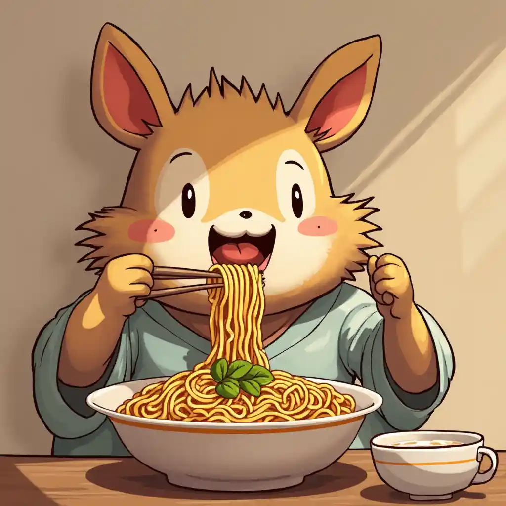 SkylarGrogu felizmente comiendo ramen en un emote estilo Studio Ghibli