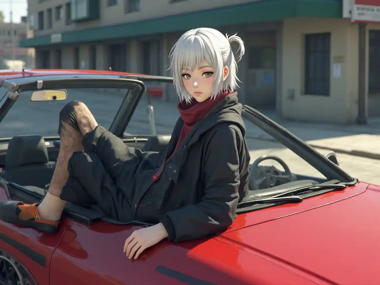 Personaje estilo GTA V, japonés, pelo blanco, coreano, posando de lado en un vehículo Supra