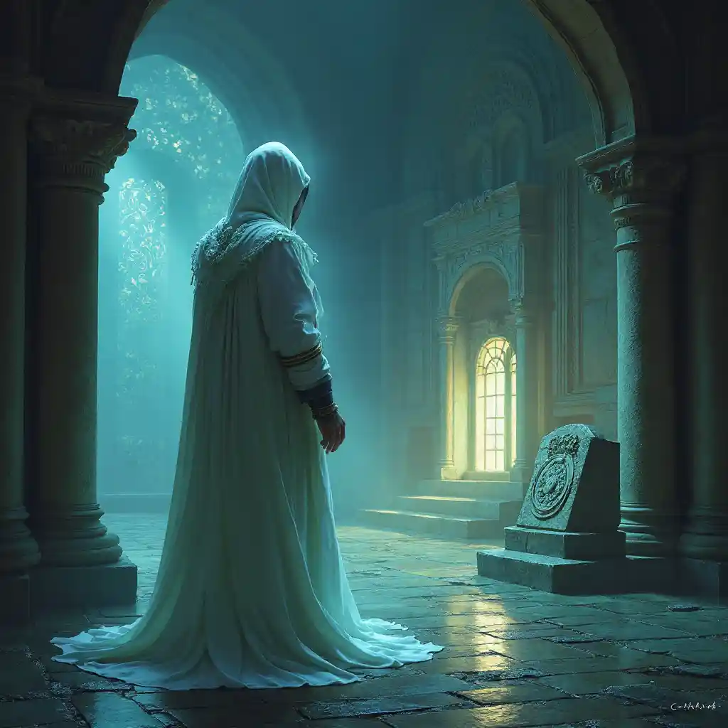 (espíritu de soldado iluminado), custodiando un templo, apariencia fantasmal, entorno de fantasía medieval, aventura DND, iluminación mística suave, azulejos brillantes serenos que reflejan patrones luminosos, ambiente sagrado, tumba ornamentada cercana, atmósfera tranquila, detalles encantadores, imágenes encantadoras, entornos luminosos, ultra-detallado, alta calidad, símbolos de protección y espiritualidad.