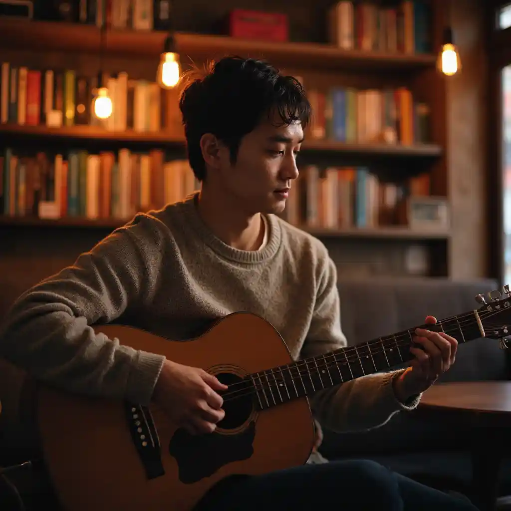 Tocando la guitarra en un acogedor café, un hombre asiático de unos 30 años brilla con un suéter informal. Las cálidas luces y las estanterías lo enmarcan, su música conmovedora exuda calidez y pasión artística.