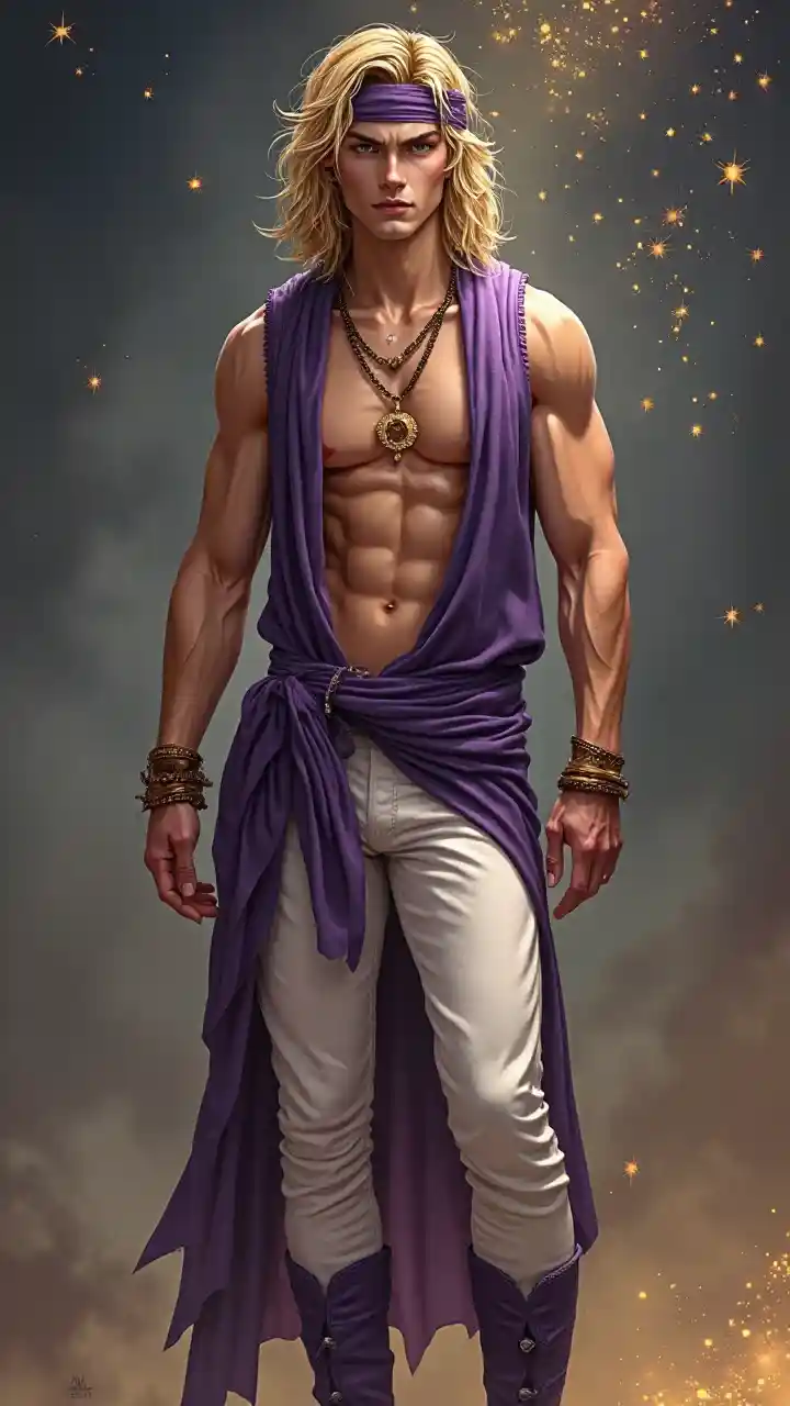 Gitano, místico, mágico, caminante entre los mundos. Masculino, principios de los veinte. Cabello rubio arenoso de longitud media, bufanda morada atada alrededor de la frente. Ojos de color avellana pálido, mirada intensa. Ceja y mentón fuertes, guapo, modelo, joven. Parche de alma en la cara. Cuerpo delgado pero musculoso, fuerte, delgado, bien definido. Cuerpo liso con un mínimo de vello corporal. Chaleco de gamuza púrpura, abierto, pecho expuesto. Talismán gitano dorado alrededor del cuello. Mallas/pantalones deportivos blancos, faja morada envuelta alrededor de la cintura. Botas hasta la rodilla de gamuza morada, botas desgarbadas. Aura brillante dorada mágica. Pose de cuerpo entero, fondo celeste.