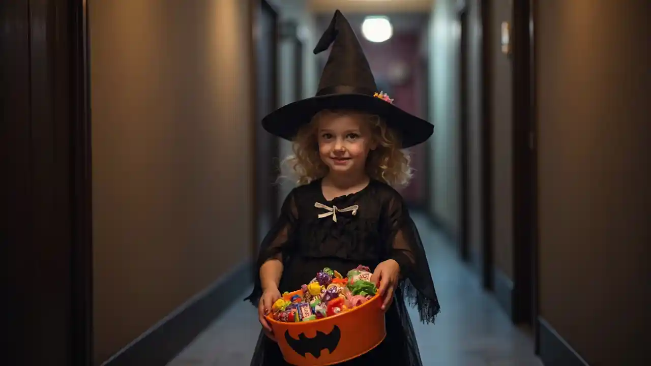 SavannahUna niña vestida con un disfraz espeluznante de Halloween se encuentra en un pasillo poco iluminado, agarrando una bañera rebosante de coloridos dulces.