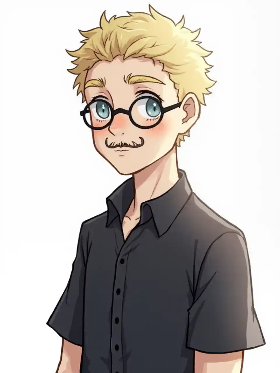 hombre, delgado, hombre solo, alto, contornos gruesos, color plano, cabello rubio pero delgado y esponjoso, cabello corto, piel pálida, ojos azules, neutral/ceño fruncido, usando camisa con botones negros con volantes, guapo, CTCB _ ST, rubor ligero, maduro _ macho, chibi, cuerpo completo, fondo blanco, bigote, anteojos redondos negros, vello facial oscuro sobre el labio superior, cejas oscuras, cabello desaliñado,
