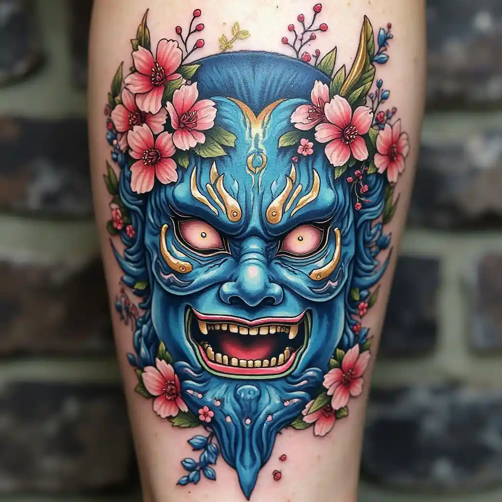 Harrisongenerar para mí un tatuaje de la máscara hannya con detalles de cerezos en flor en agua con el color azul