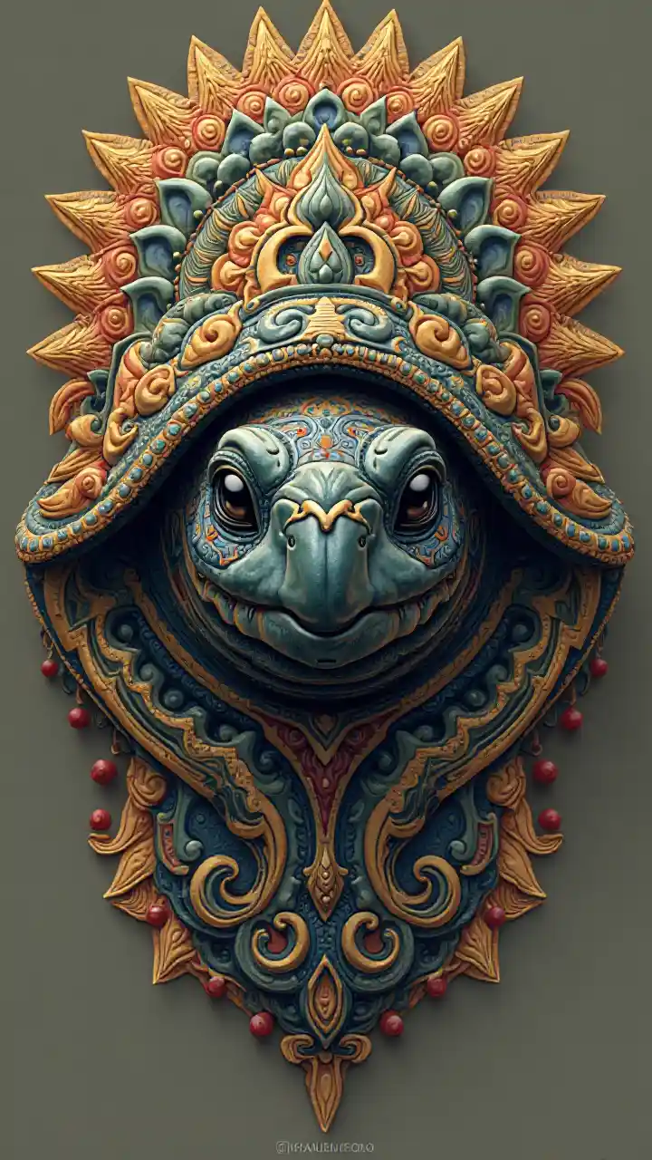 Tipo de imagen: Fotografía (((Descripción del sujeto: cabeza de pared realista)) Ilustración digital realista de una TORTUGA DE HAWKSBILL retratada de una manera estilizada e inspirada en el arte tribal para representar la TORTUGA DE HAWKSBILL y su significado