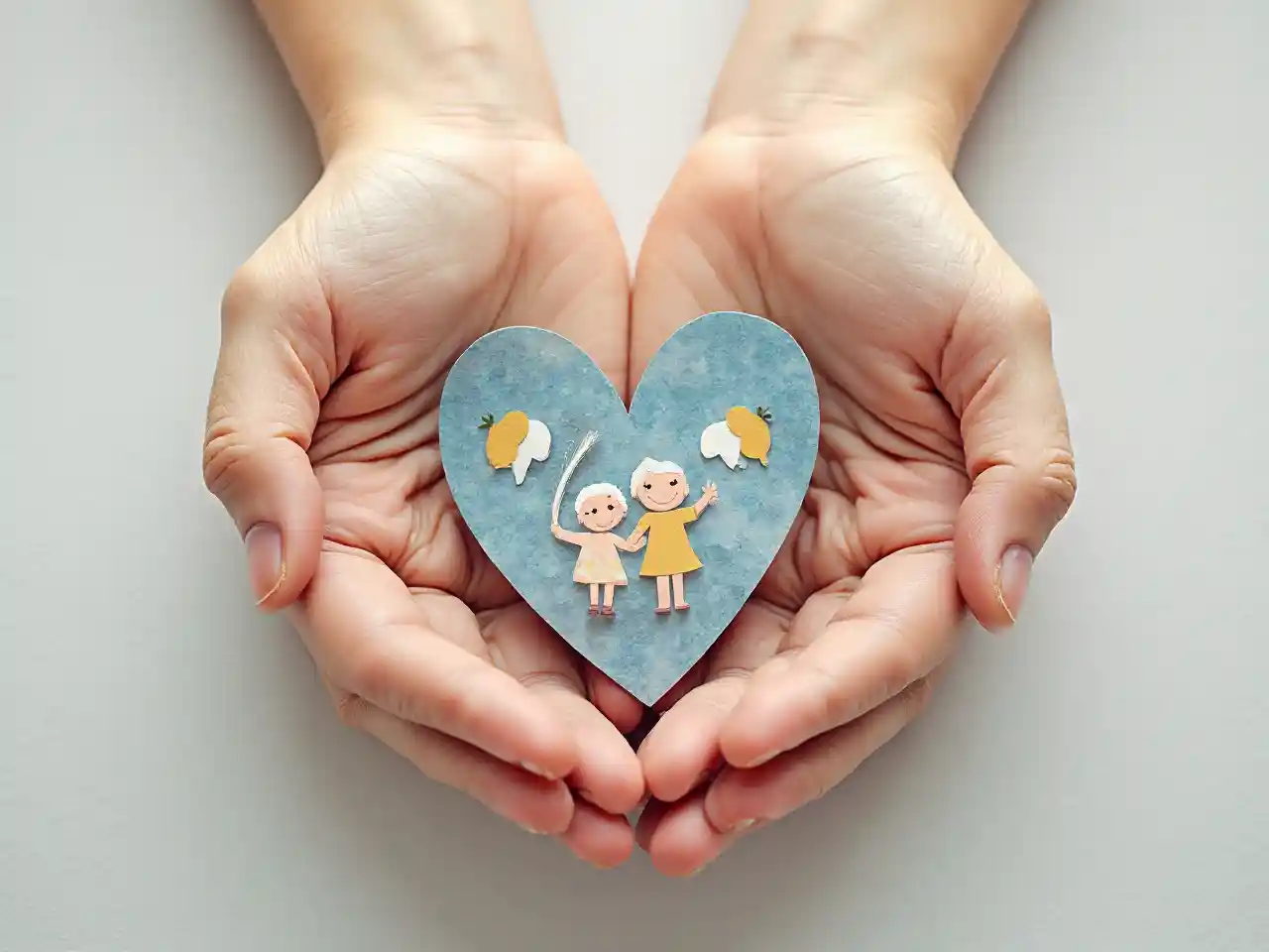 LincolnCollage de papel, manos abiertas de una familia de tres: papá, mamá e hijo, sosteniendo un corazón de cristal