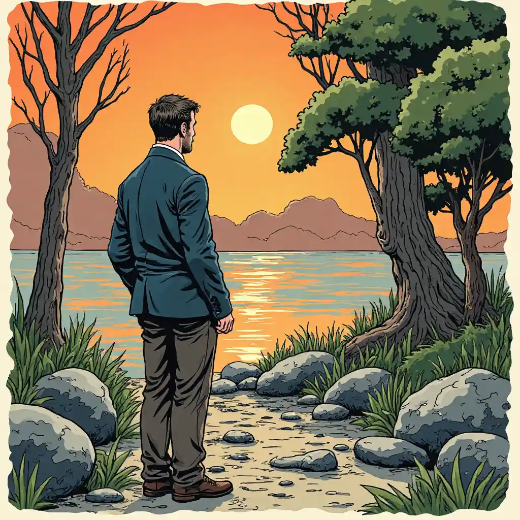pluma y tinta, ilustrado por Hergé, el hombre solo para siempre. Tristeza, combinación de colores impresionante, obra maestra