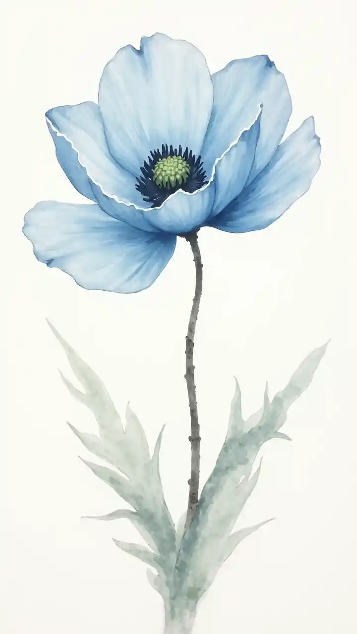 Una pintura sumi-e de la Amapola Azul del Himalaya, sus pétalos representados con pinceladas suaves y fluidas en tinta azul claro. Los pétalos se superponen suavemente, creando una sensación de delicadeza y tranquilidad. Las líneas de tinta negras expresivas forman los tallos y las hojas, mientras que los lavados ligeros de azul y verde agregan un sombreado sutil. El fondo se deja al descubierto, enfatizando la belleza serena de la flor. Creado con: técnicas de sumi-e, tinta azul suave, pinceladas delicadas, líneas expresivas, forma serena y minimalista