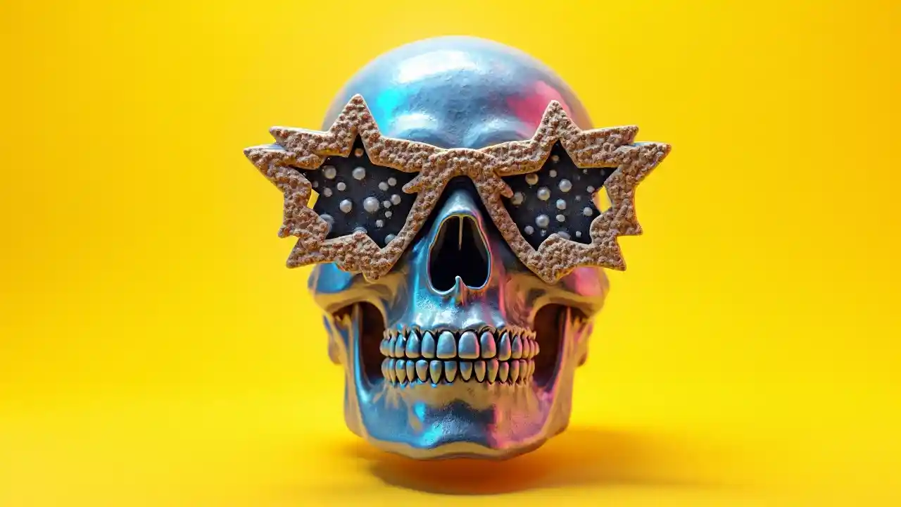 un cráneo hecho de material holográfico con gafas en forma de estrella y lentes de piel de leopardo, fondo amarillo