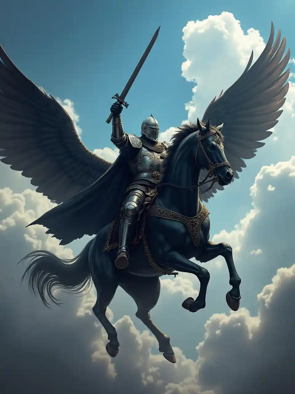 Cruzado Oscuro sosteniendo una espada, el soldado de lo sagrado, luchando por lo mejor, montando un pegaso negro y fuerte sosteniendo una espada poderosa que apunta al cielo con todas sus fuerzas. Pegaso volando en el aire entre las nubes, cielo azul, puerta de entrada al cielo.