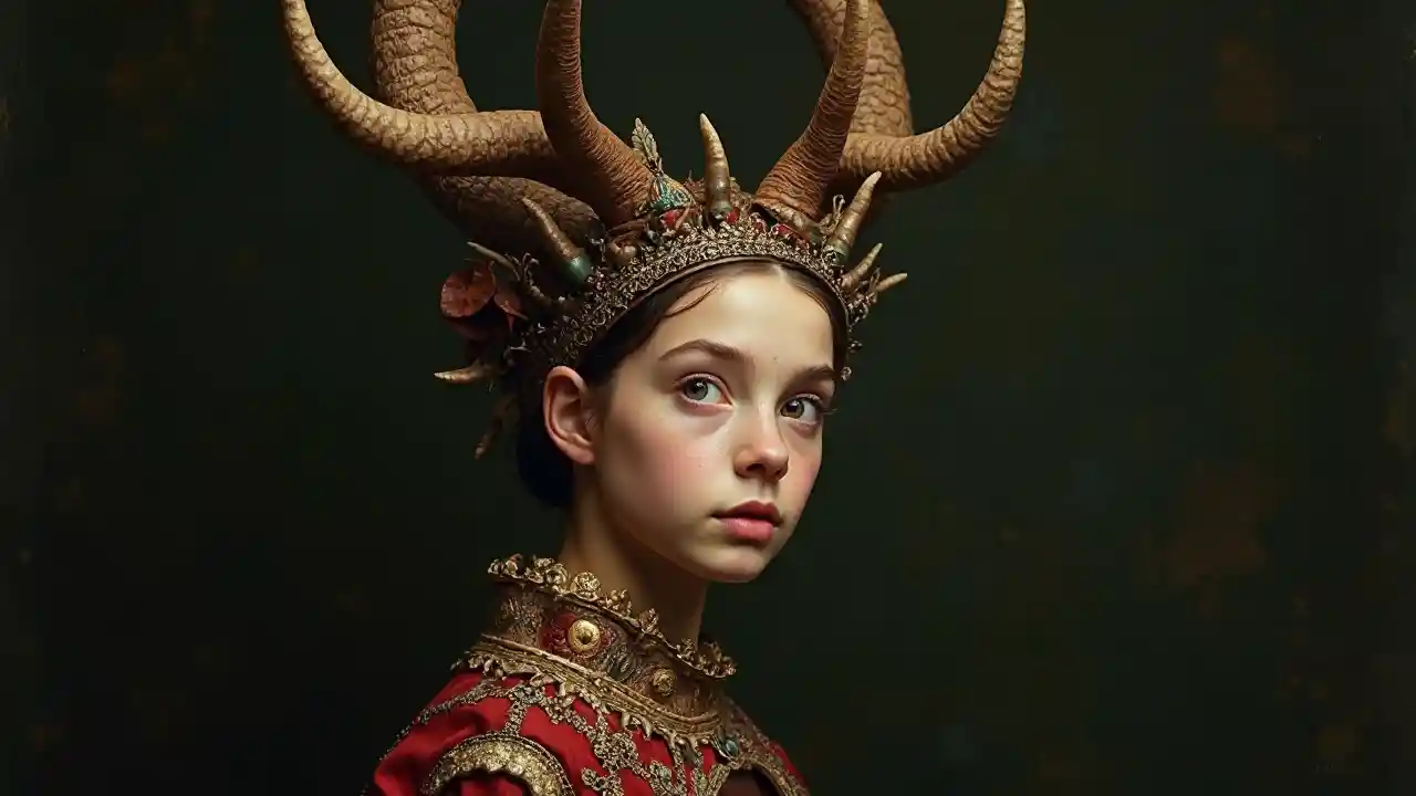 una niña lleva un tocado con cuernos en él, en el estilo de retratos de vida silvestre hiperrealistas, verde oscuro y rojo, sofonisba anguissola, bess hamiti, arte medieval, representaciones naturalistas de flora y fauna, glen orbik