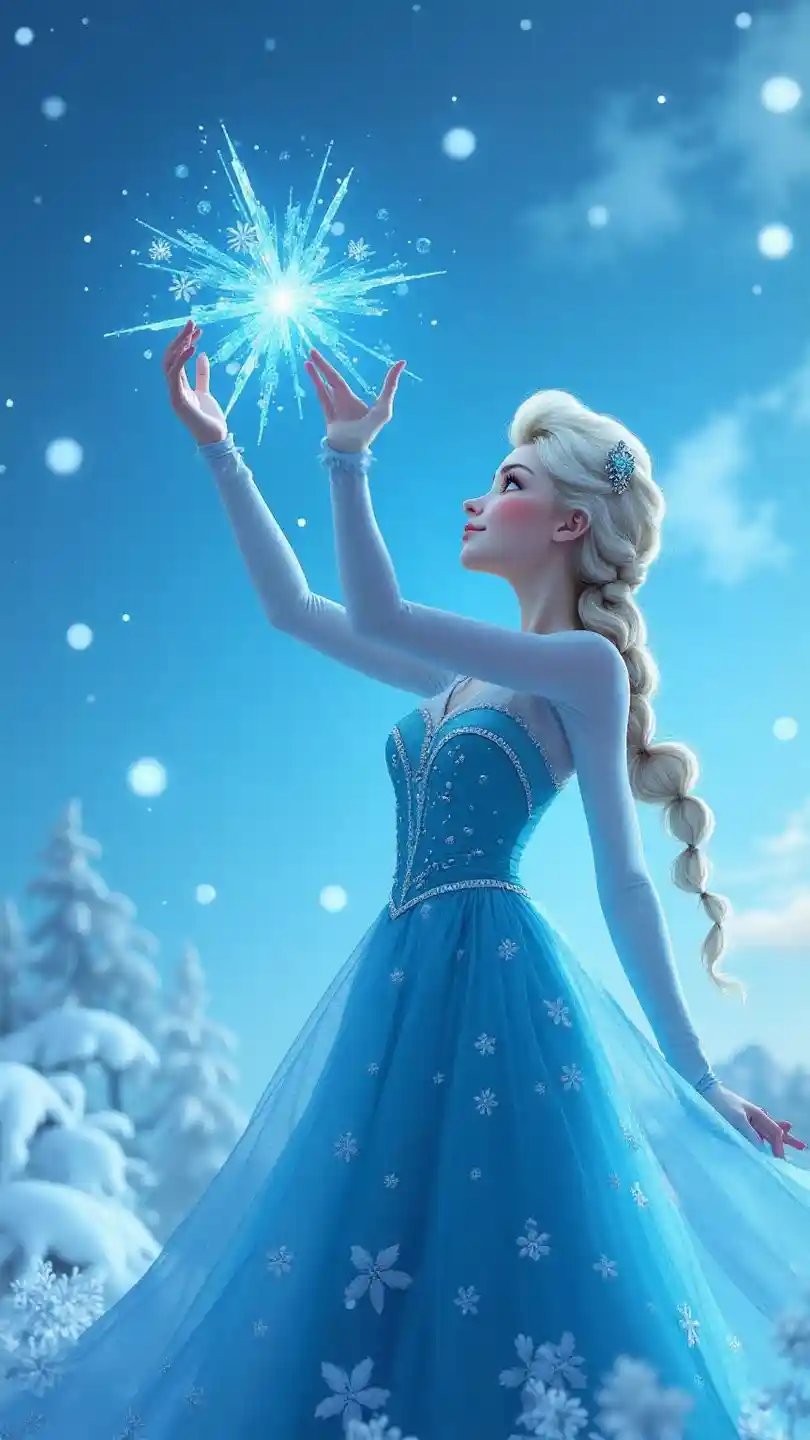 ChloeCielo azul con cristales de hielo flotando, Una escena fantástica donde una elegante princesa con un vestido azul levanta la mano para crear una hermosa magia de hielo, realista y vi