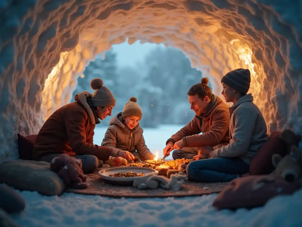 La vida en un iglú, una mujer preparando el almuerzo dentro de un acogedor iglú, su marido y sus hijos a su alrededor, suave resplandor helado iluminando las paredes, ambiente sereno de invierno, nieve cayendo suavemente fuera, alta calidad, ultra detallada, calidez familiar, amor y risas llenando el ambiente. < < THE _ MARKER > > La vida en un iglú.