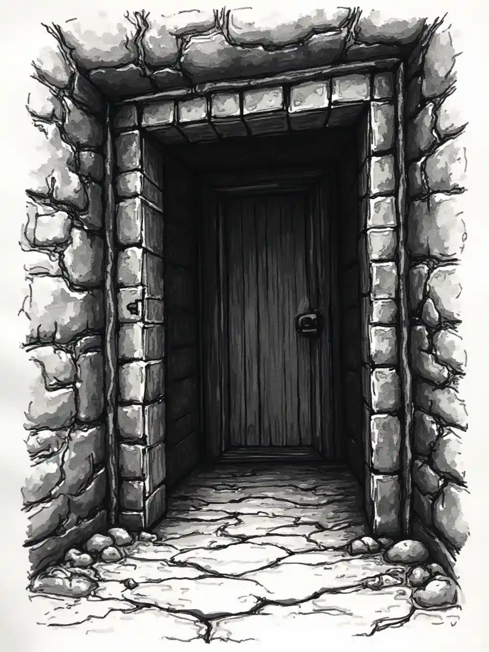 Dibujo a lápiz de tinta de una puerta oscura del sótano.