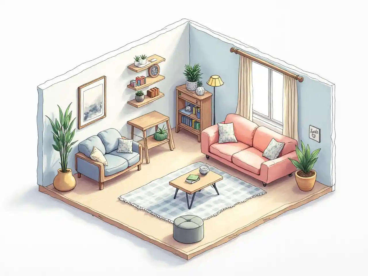 Interior simple isométrico dibujado a mano con acuarela