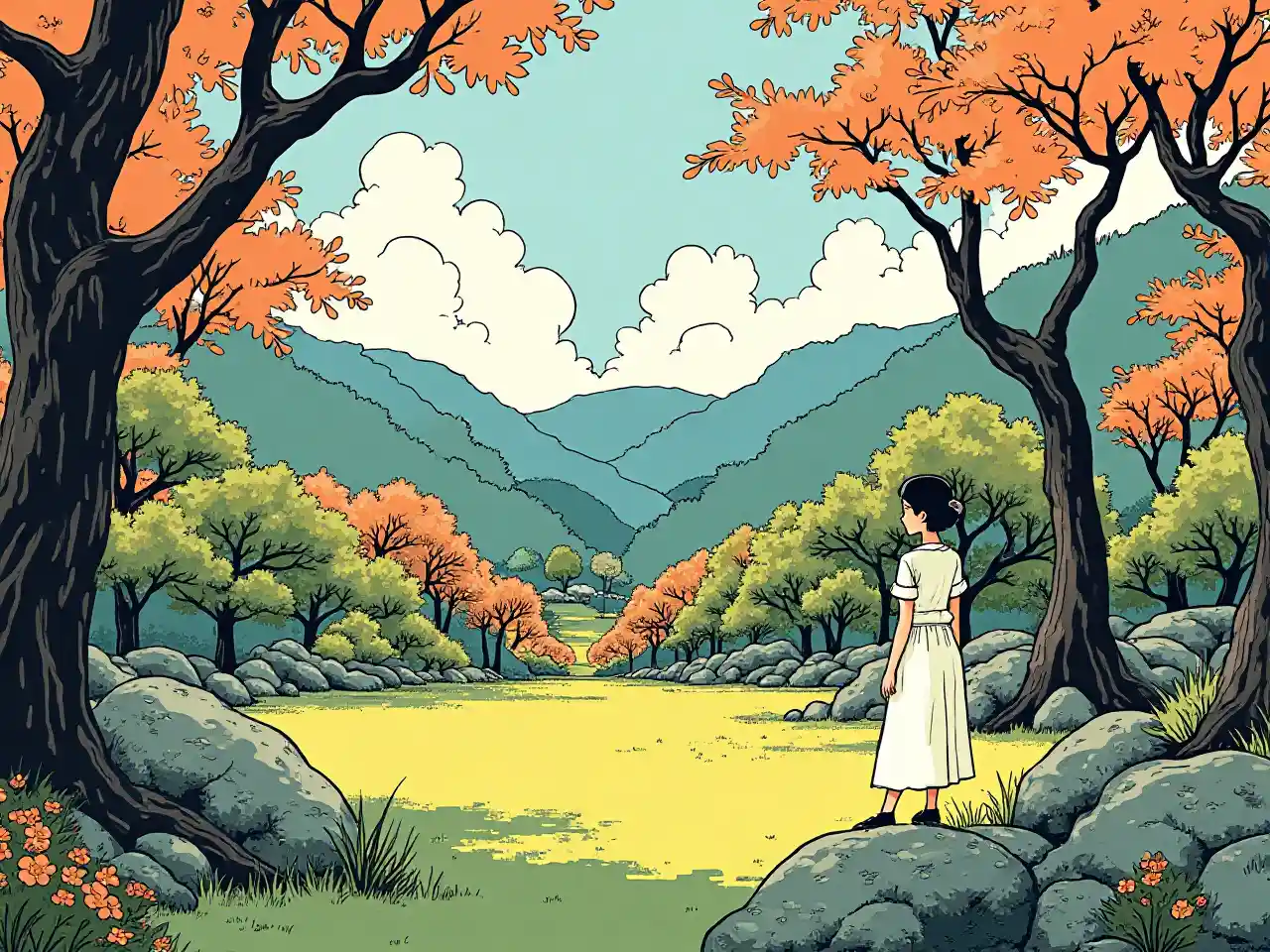(manga línea dura, novela gráfica, sombra dura, tinta de color ancho ilustración de Jean Giraud Moebius) un jardín japonés en hokkaido en primavera, una mujer japonesa en el fondo distante, vista desde atrás