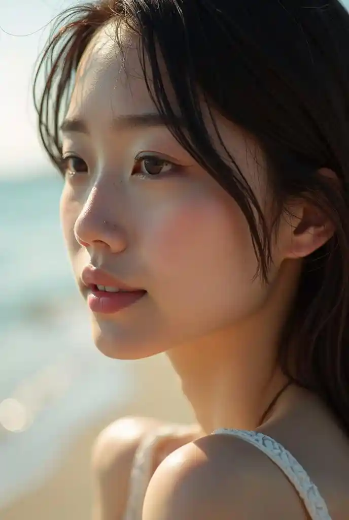 Alexandersombra, primer plano: 0.75, solo, Imágenes realistas en colores cálidos, Fondo extremadamente borroso: 1.331, realista, Hermoso rostro de mujer japonesa, En la playa: