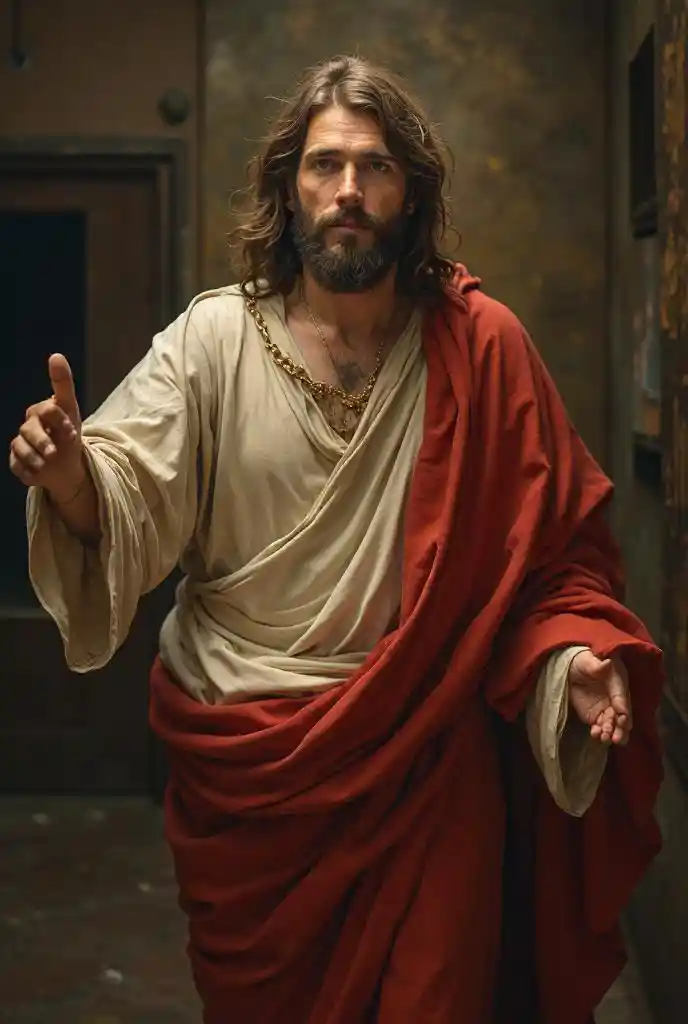 Ethan(((obra maestra))), ((foto realista)), toma de gran angular; ((((Jesucristo: 1.4))) se muestra en un (((toma media en la parte inferior del marco))), usando un ((fut