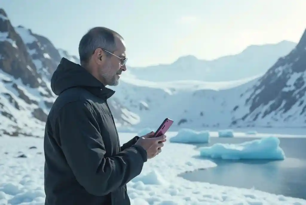 EllaEn la foto imaginaria, se representa a Steve Jobs de pie con confianza en primer plano, sosteniendo un elegante iPhone mientras captura la escena. A su alrededor, la tierra helada