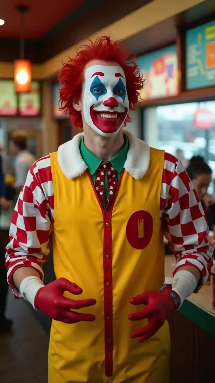 Joker in Ronald McDonald's costume working at McDonalds