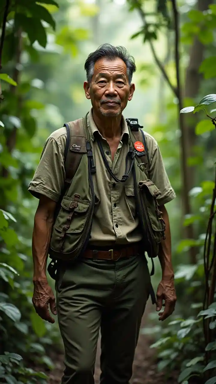 Liderando un safari en la jungla, un hombre asiático de unos 50 años brilla con un chaleco resistente. Las enredaderas y la vida silvestre exótica lo enmarcan, su liderazgo constante y sus manos desgastadas exudan fuerza aventurera y carisma natural en un exuberante y vibrante desierto.
