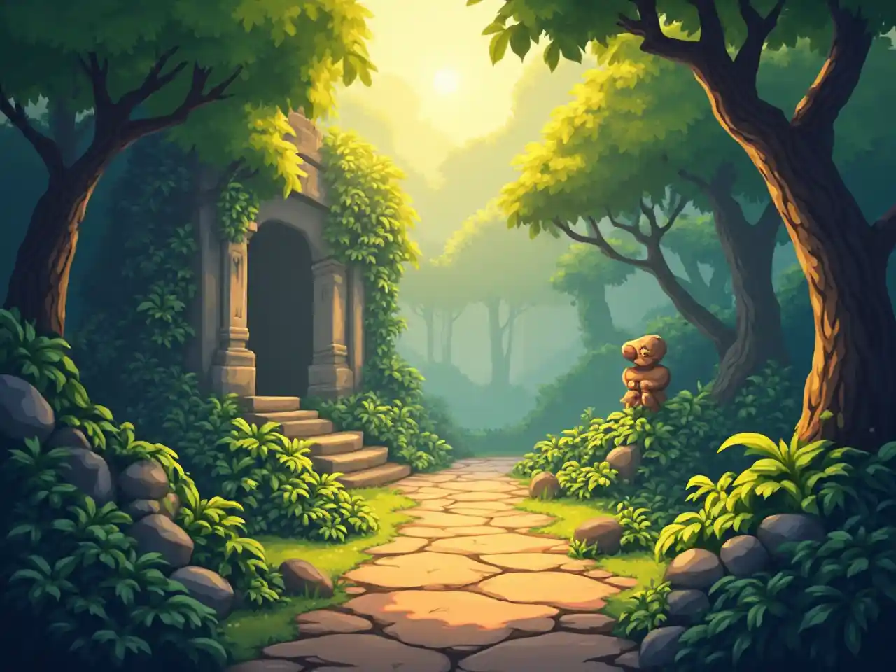 Un fondo de juego de templo de la jungla estilizado en 2D, ruinas antiguas cubiertas de enredaderas, un camino de piedra que conduce a la selva profunda, estatuas rotas, luz solar dorada que se filtra a través de los árboles, colores cálidos y vibrantes, estilo de dibujos animados, vista de desplazamiento lateral, adecuado para un juego móvil de corredor sin fin.