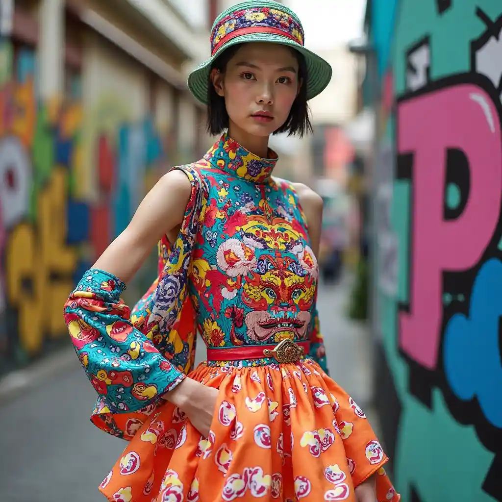 (ultra detallado) Vestido de mujer Kenzo Harajuku, colores vibrantes, patrones lúdicos, moda callejera dinámica, elementos en capas, estilo de gran tamaño, accesorios caprichosos, fondo urbano animado, graffiti colorido, ambiente (alegre), motivos gráficos audaces inspirados en la alta costura, texturas en capas, modelo con poses expresivas, (HD) visualmente llamativo.