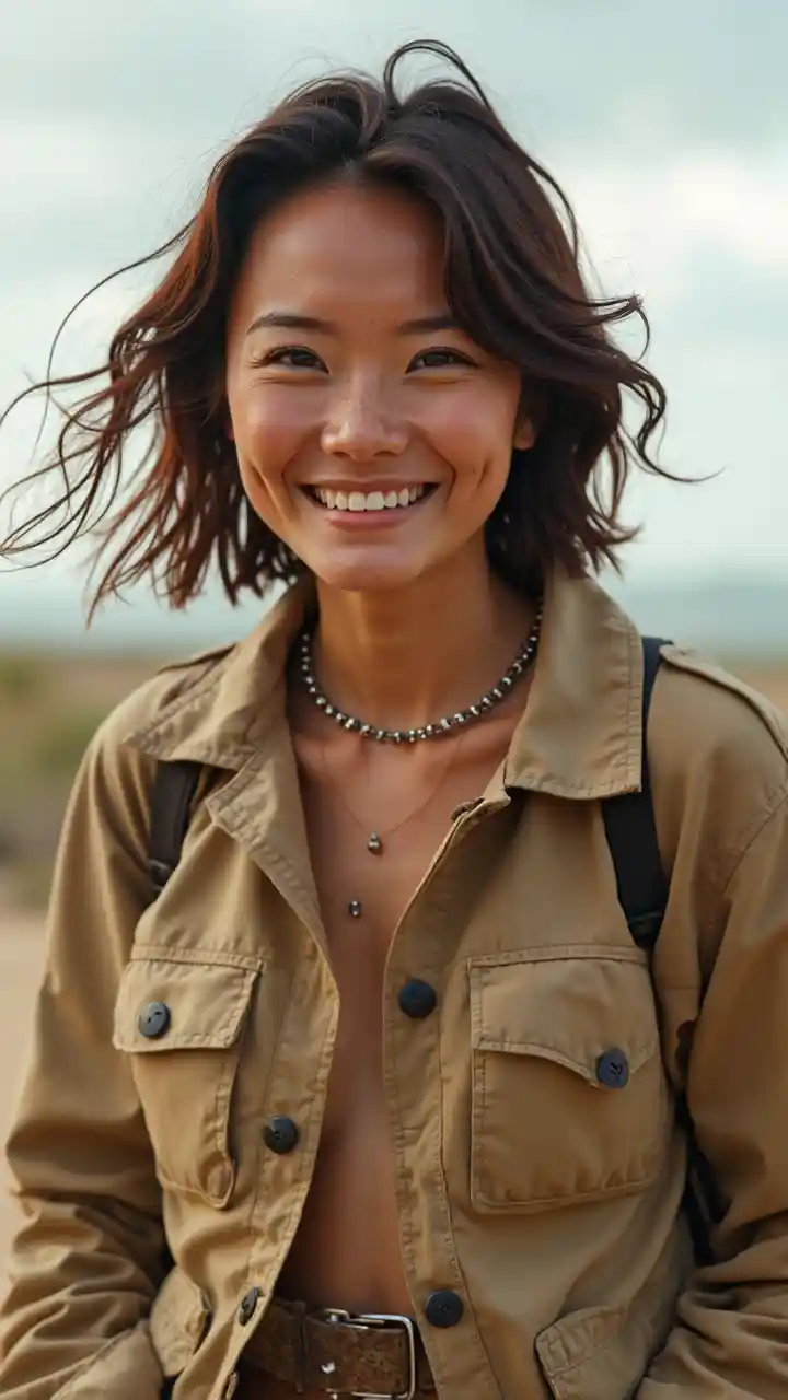 persona con actitud amistosa, fondo claro, plano lejano, realista, usa chaqueta de safari, se parece a Kim Chung con bronceado