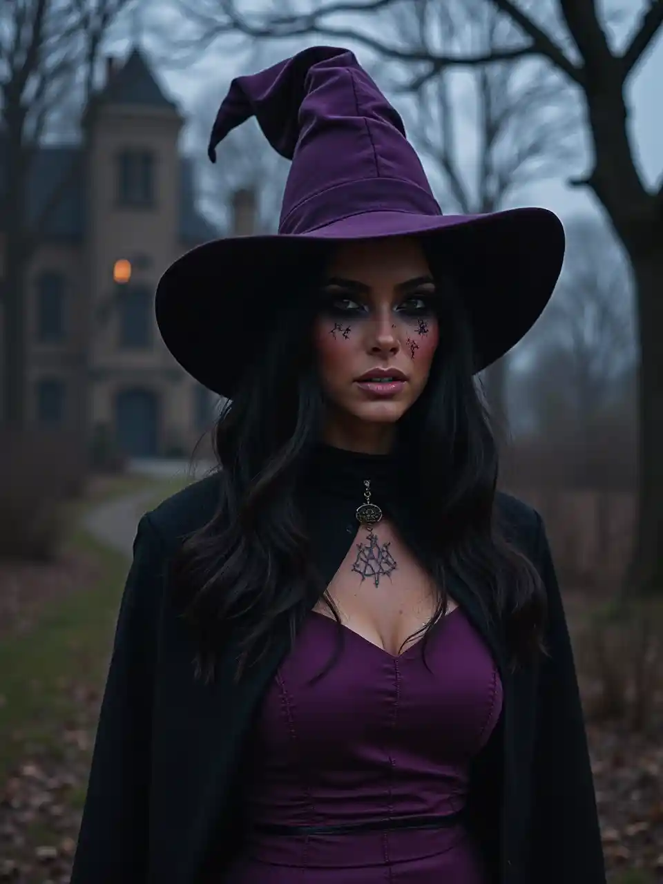 Retrato de Kim Kardashian con un disfraz de bruja para Halloween, maquillaje oscuro aterrador en su rostro, atmósfera oscura sombría, estilo vintage de los años 70, colores púrpura, rosa y negro, foto de alto detalle, foto profesional, con el telón de fondo de un viejo castillo espeluznante, contrastando luz, colores brillantes, atmósfera oscura profunda