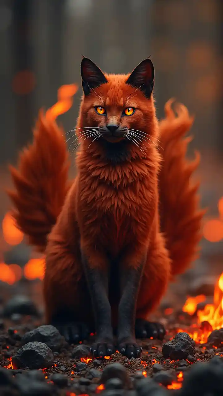 Un gato como kitsune con (((pelaje rojo intenso)) y ((marcas negras como llamas)) a lo largo de su cuerpo y colas. Su (((nueve colas largas))) se colocan detrás de su cuerpo en un arco natural que fluye, cada uno inclinado con (((débil fuego negro))). Tiene ((((ojos felinos anaranjados brillantes))) y características agudas y alertas. El kitsune se encuentra en un claro quemado rodeado de brasas y tierra humeante. Las llamas negras se elevan suavemente a su alrededor sin tocar su pelaje. La iluminación es cálida y dramática, proyectando sombras profundas a través del paisaje quemado. La atmósfera es antigua, mágica y está llena de energía de fuego controlada.