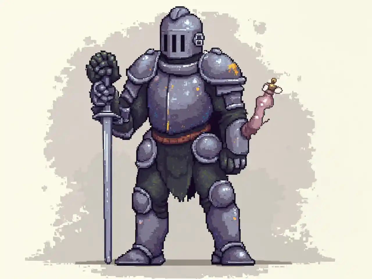 Pixel art, 32x32, 16 bits estilo clásico de juego retro, de un caballero que lleva en una mano un guante blindado totalmente de gran tamaño, y sostiene una espada con la otra mano, vista lateral.