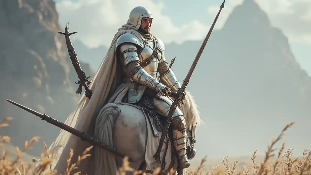 Un chevalier en armure blanche munis d 'un puissant arc et accompagné par un faucon. Il a une armure futuriste et efficace. Un guardabosques chevalier rayonnant contre l 'anathème