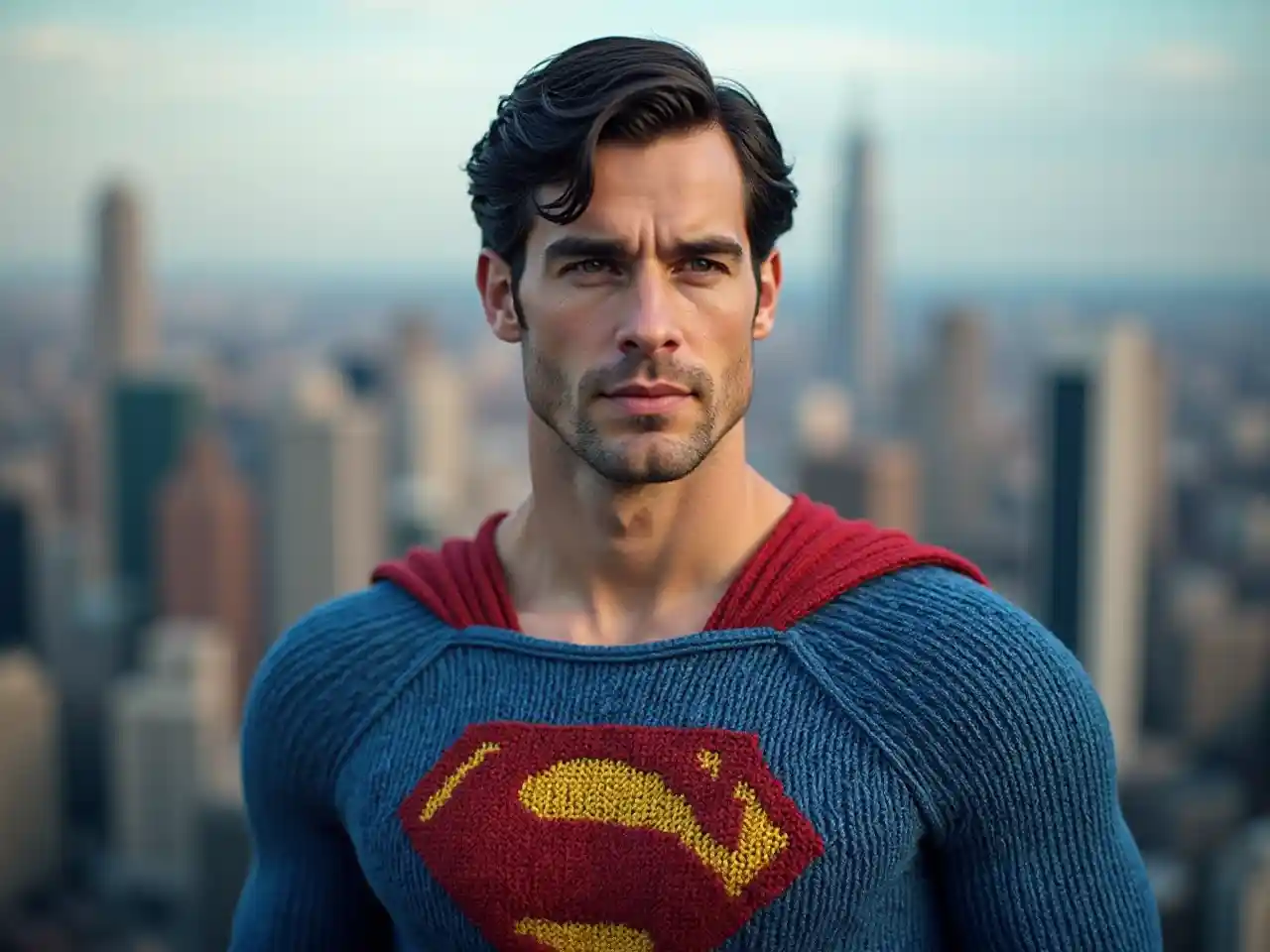 Retrato de un superhombre con un traje de punto, tejido de punto de gran textura, traje azul con un logotipo de superhombre rojo y amarillo en el pecho, ciudad en el fondo, fondo borroso, plano profesional, colores saturados brillantes, enfoque nítido, muy detallado