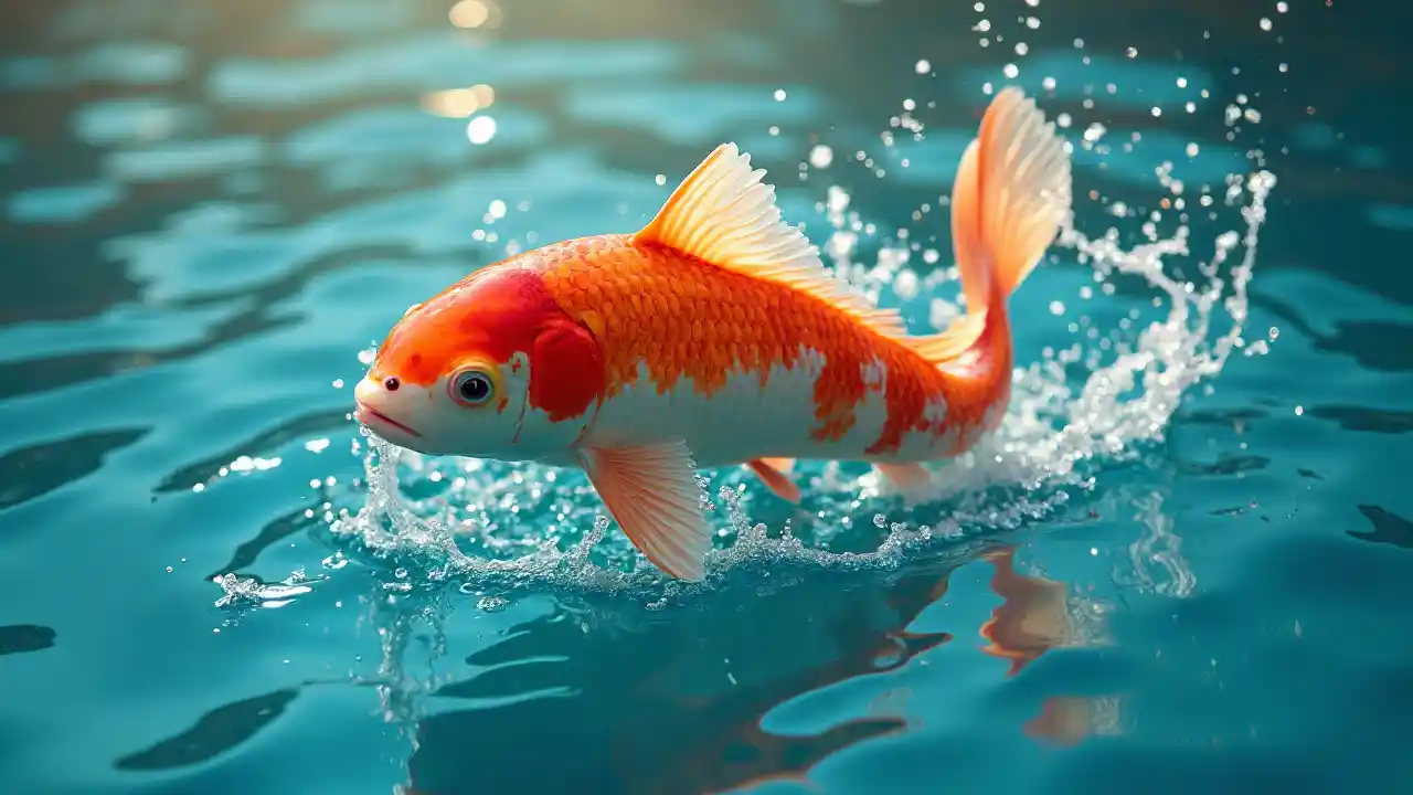 Crea una imagen de un gran pez koi rojo y blanco saltando de la superficie del agua. El agua azul clara se extiende y salpica por toda el área con la luz del sol brillando, haciendo que el color dorado brille.