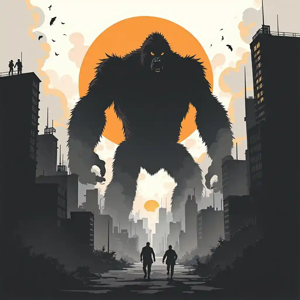 Cartel en blanco y negro que muestra una silueta de una ciudad colapsando y gente corriendo aterrorizada por la destrucción provocada por un gorila gigante como un robot de King Kong. Detrás de este gorila se puede ver un amanecer anaranjado. Usa detalles mínimos, máximo 3 colores, perspectiva desde abajo