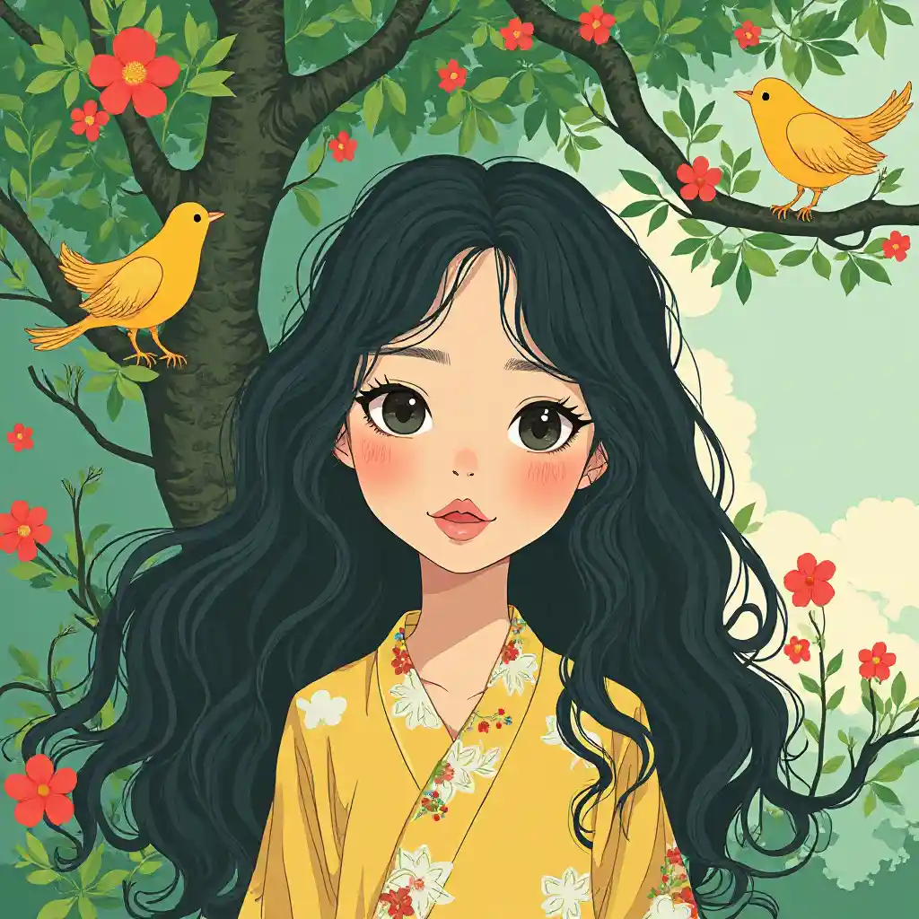 hermoso lindo retrato frontal Ninfa coreana, gran cabello largo y rizado, hierbas colores pastel, junto a un árbol verde con hojas verdes, pájaros amarillos voladores, flores rojas por victo ngai, kilian eng, iluminación dinámica, arte digital, arte de takato yamamoto, 8K Akira Diseño de estilo