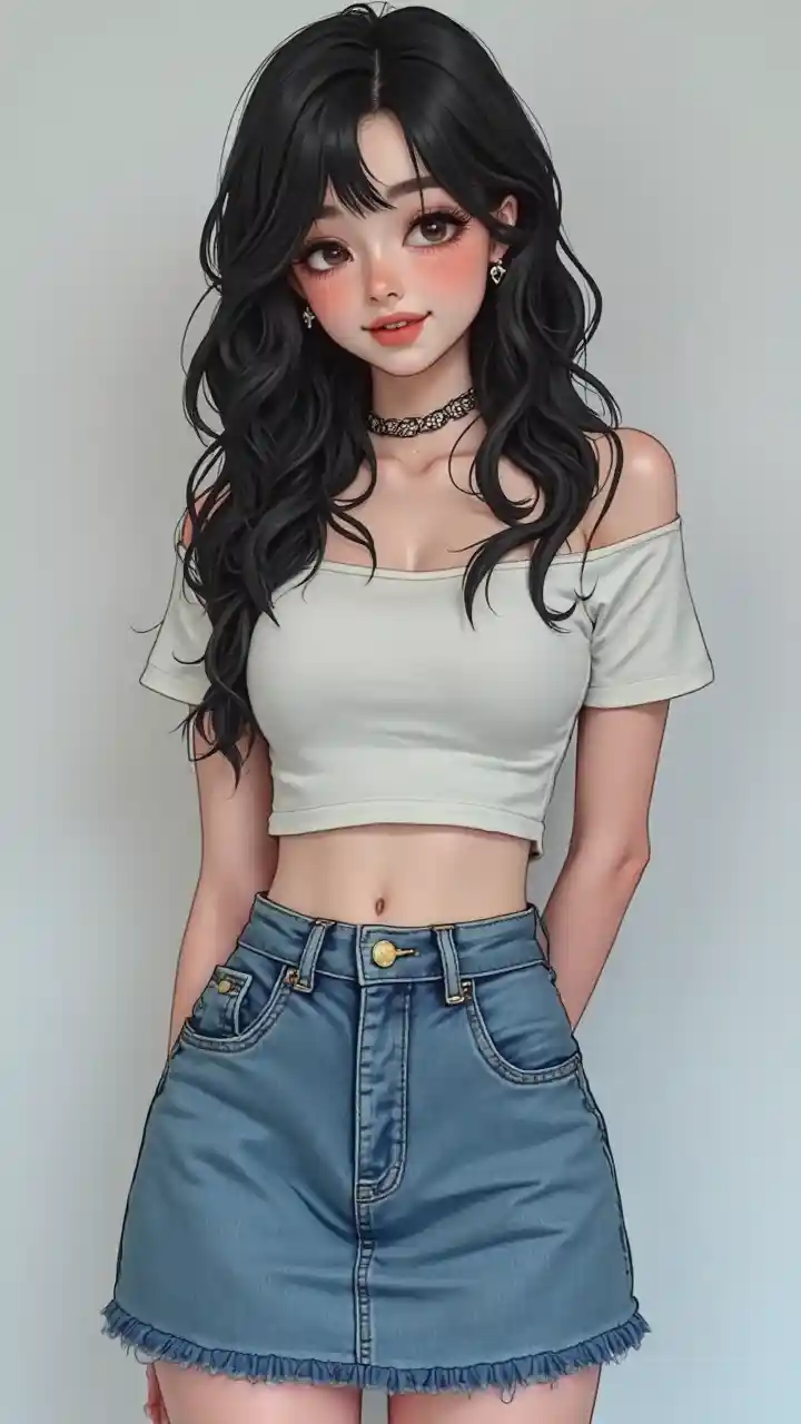 una chica kpop con falda de jean de pelo negro y crop top blanco