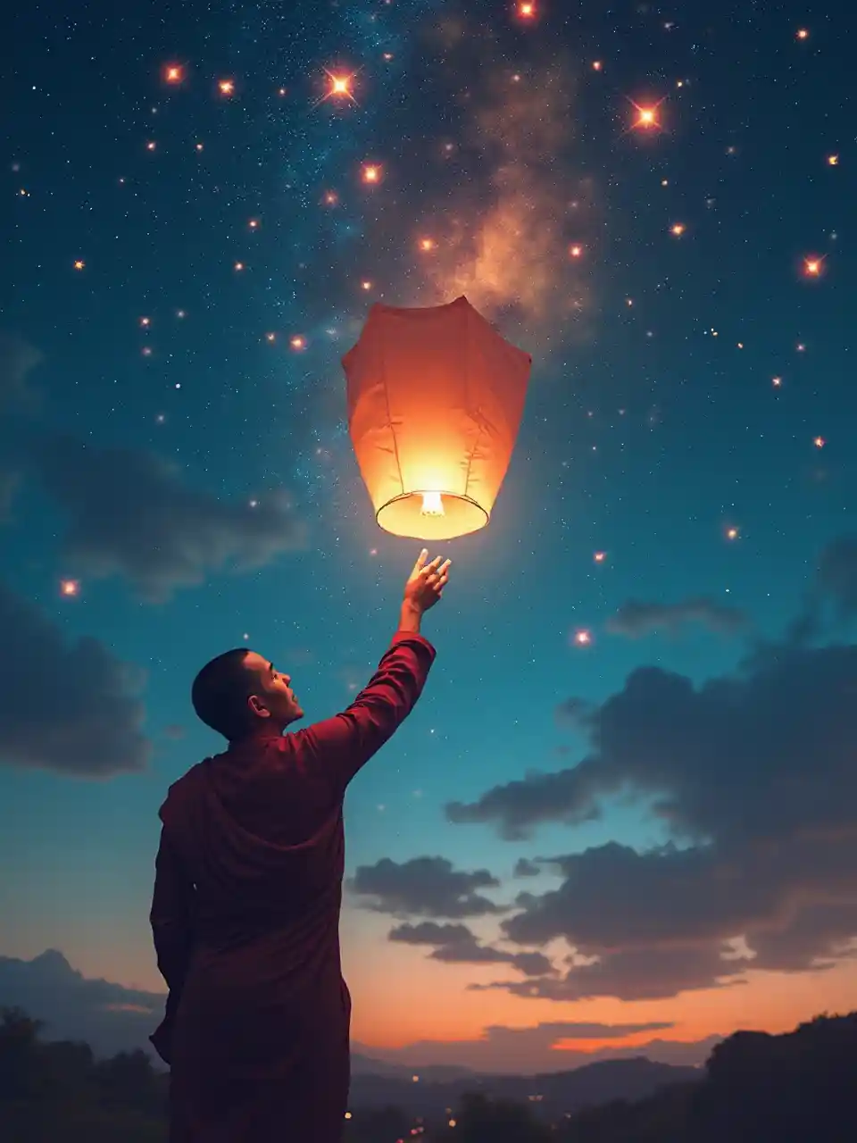 Un monje suelta suavemente una linterna de papel brillante en el cielo crepuscular lleno de coloridas estrellas y galaxias, colores hiperrealistas, emocionales y vivos, simbólicos de dejar ir.