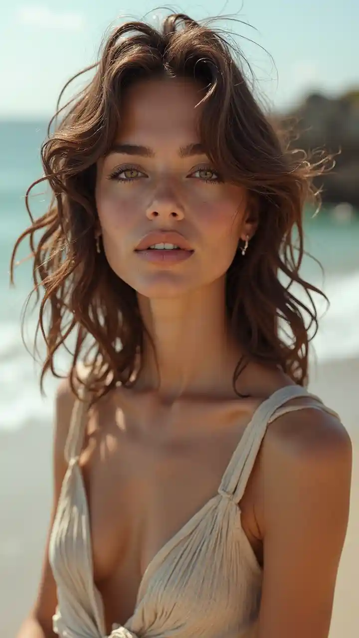 Retrato de hermosa modelo de moda latina, de ensueño, sesión de fotos de annie leibovitz, sesión de fotos editorial de la revista de moda, poses de moda, frente a la playa una sonrisa suave