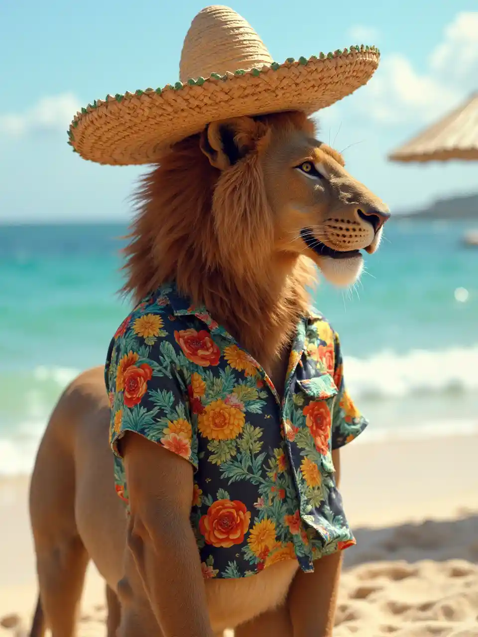 león de perfil, de pie hacia la cámara, con un sobrero mexicano, con una camisa hawaiana, con la playa de fondo — v 5 — q 2 — s 250