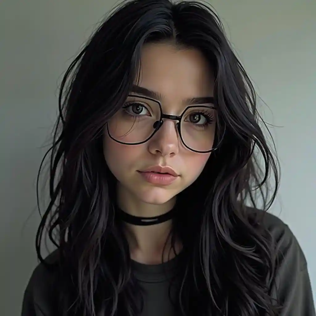 Pelo negro con pelo largo, ojos oscuros y gafas Gafas delgadas