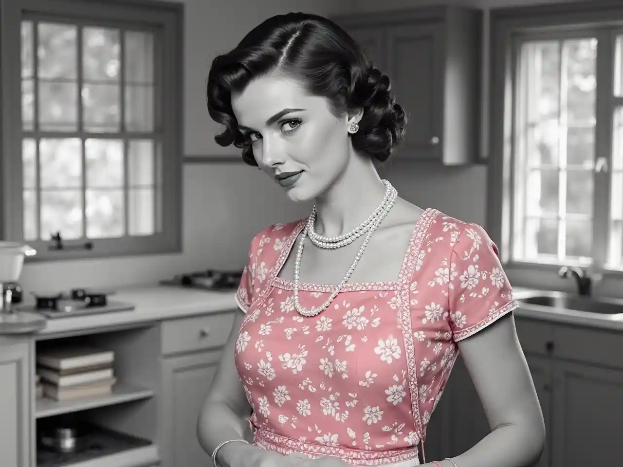 A ((estereotipo de una mujer de una cocina ocupada en la década de 1950, la era de 'Madame in the PinkApron' (una ilustración clásica en blanco y negro que captura la esencia de una era pasada) con (((una mujer equilibrada y elegante)) con piel impecablemente limpia, lujosos labios brillantes y exquisitos collares de perlas. Está vestida con un (((vestido de chintz rosa vívidamente detallado)), acentuando perfectamente su figura y complementando su sofisticación y encanto en general.